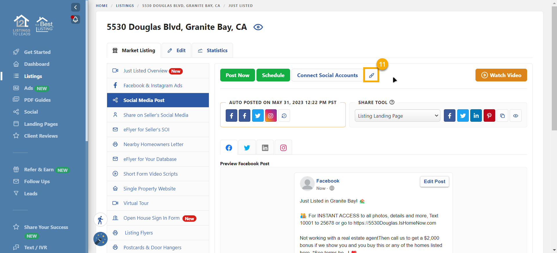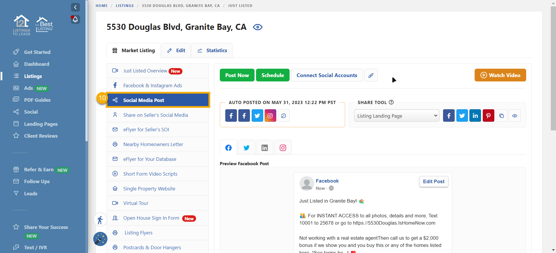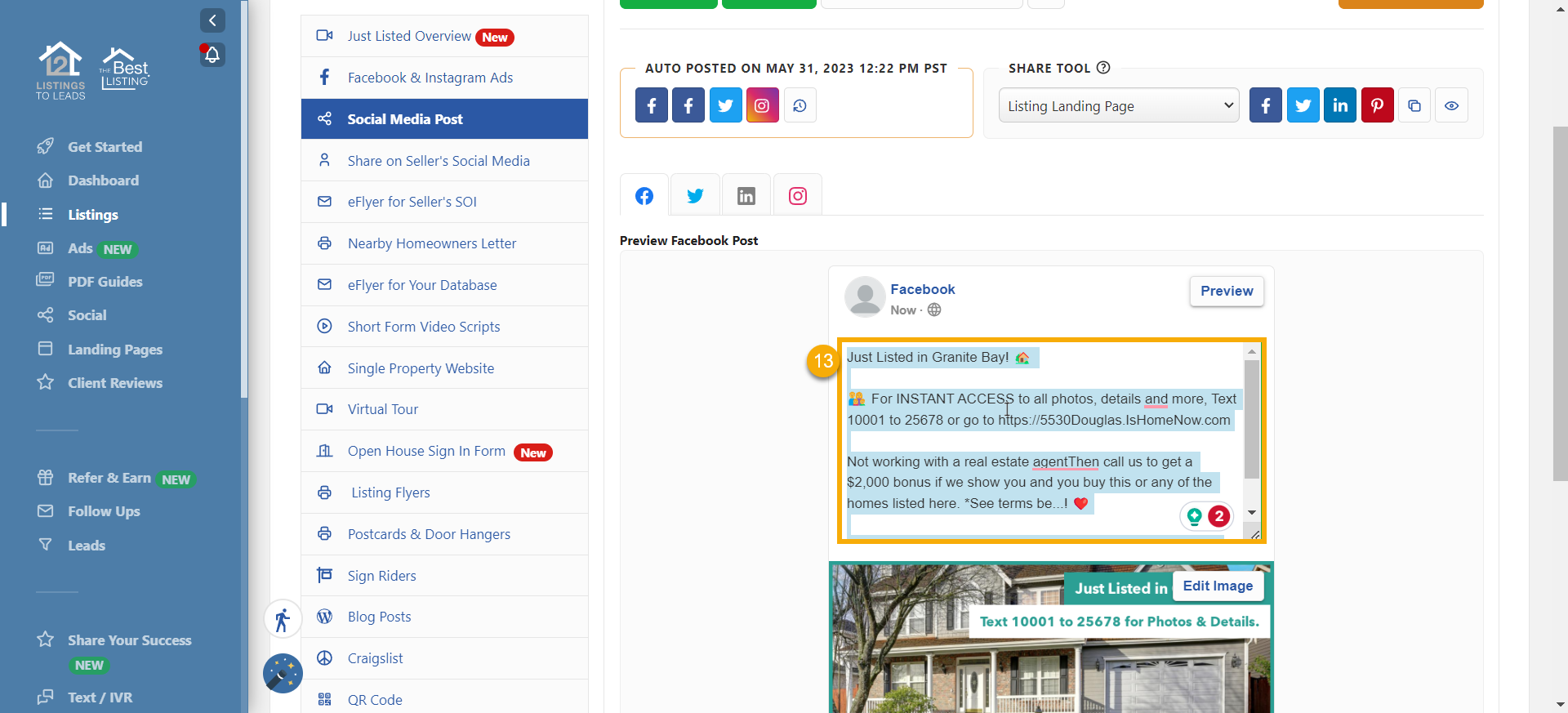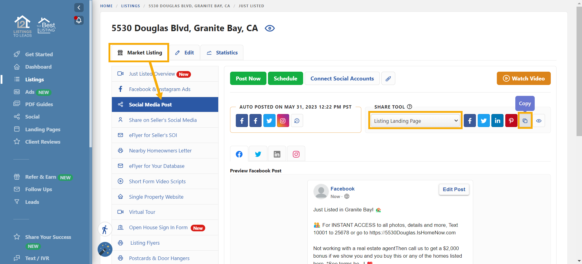 - Now go to your Listings-to-Leads account, select the listing you want to promote by clicking the Market Listing button, and go to the 'Social Media Post' tab.