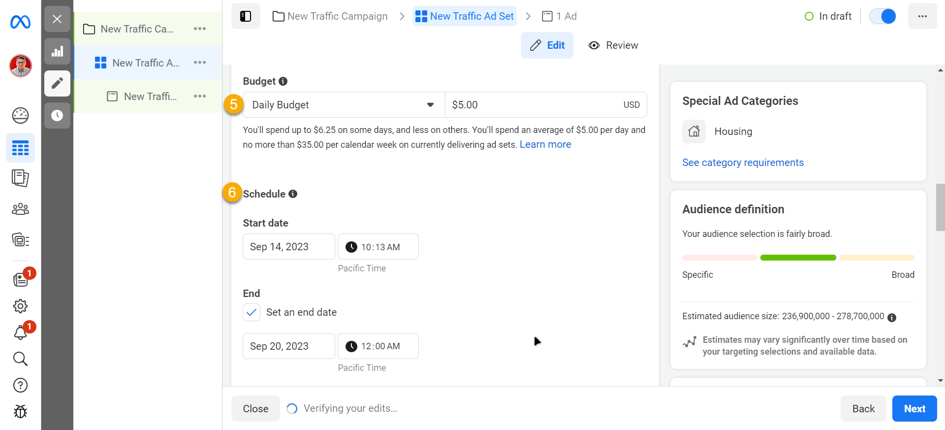 Adjust the Dates in the Schedule section (We recommend running ads for a week).