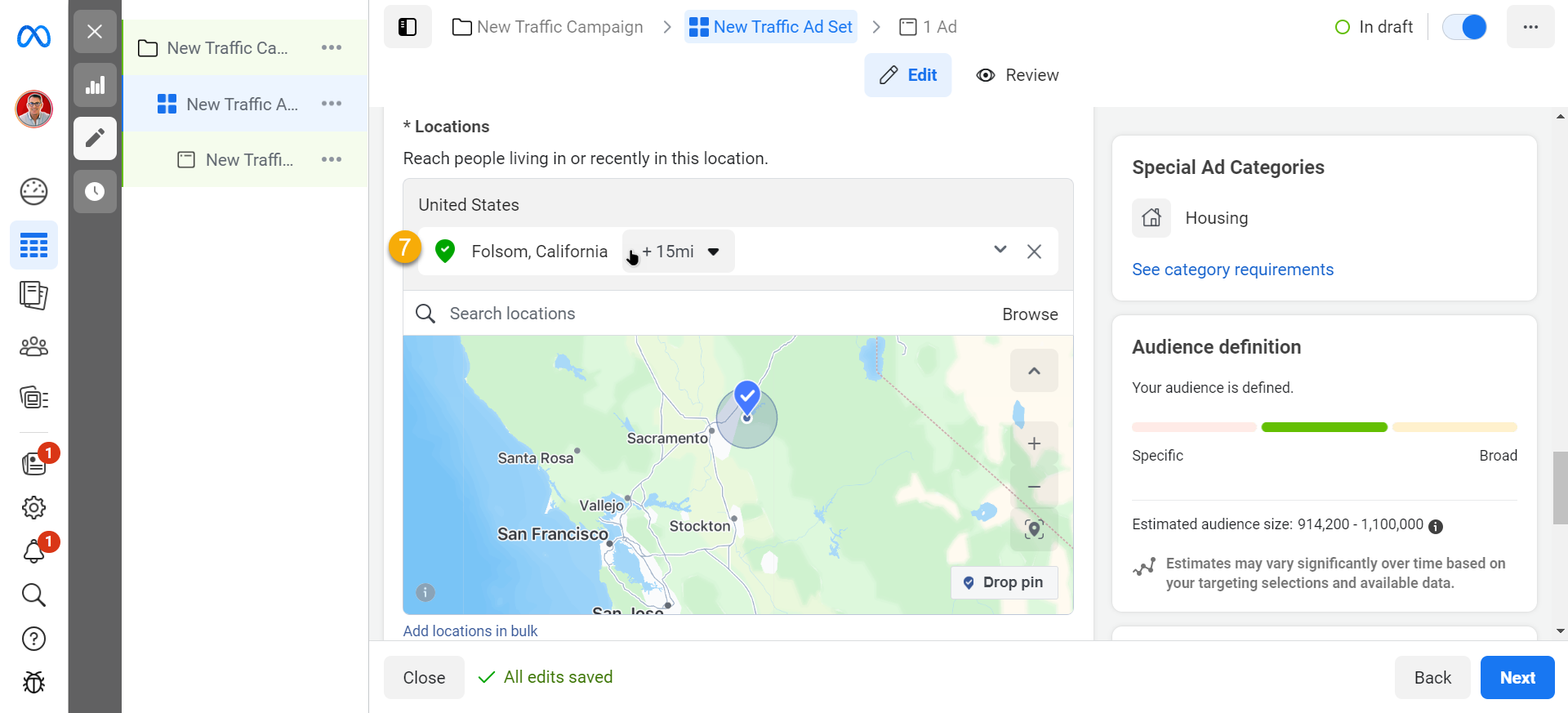 - Scroll more and enter the city/area you want to target in the Locations section.