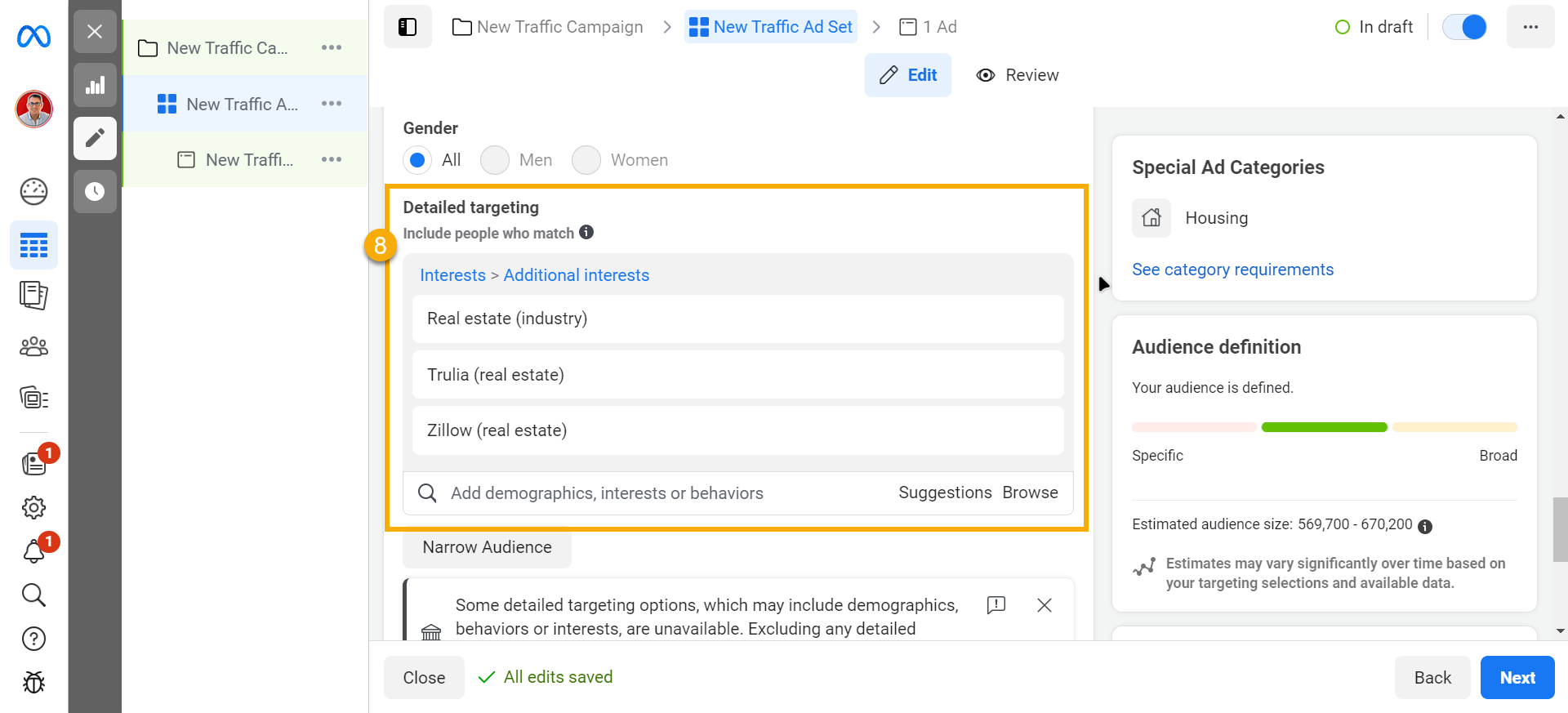 - Add real estate interest (Optional) in the Detail Targeting options and click Next.