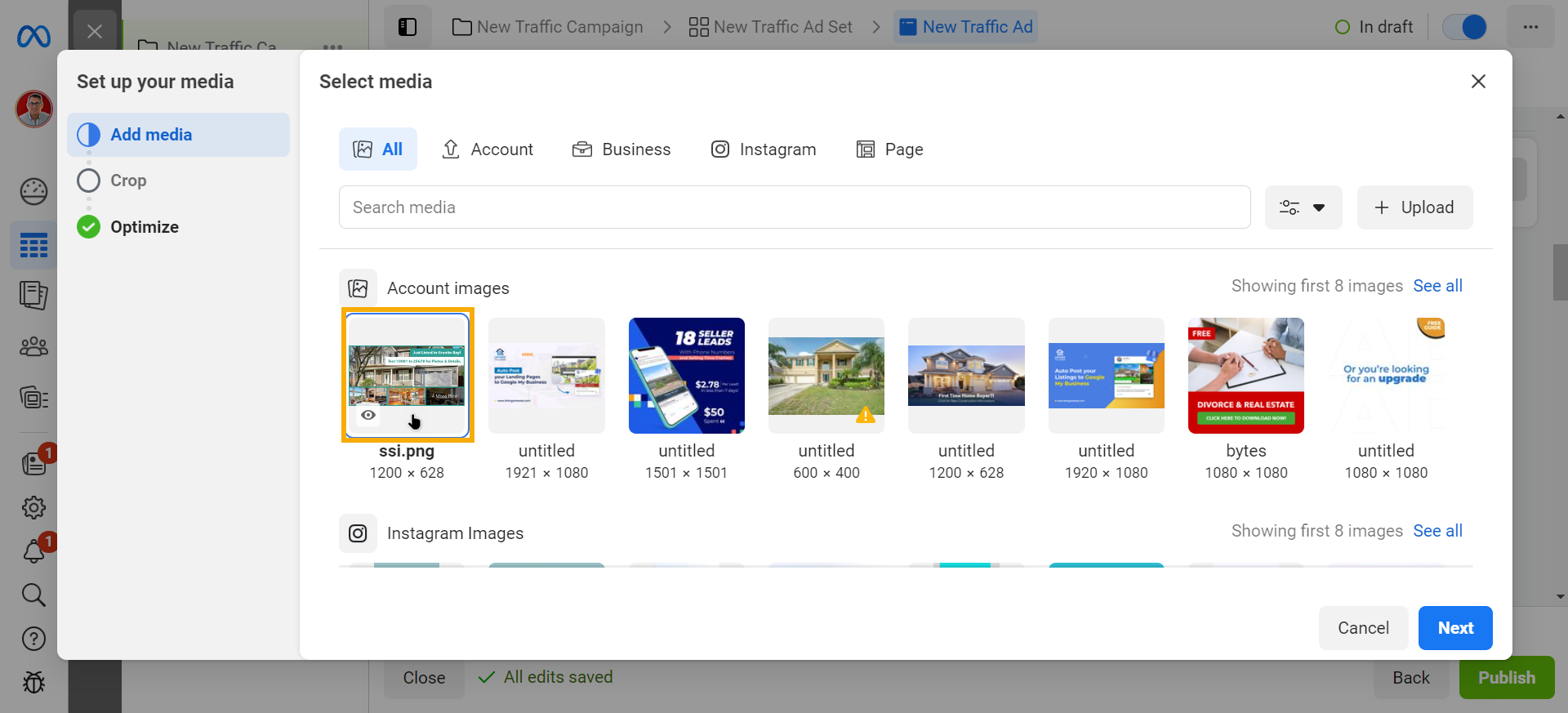 - Go back to Facebook Ads Manager. In the Ad Creative section, click Add Media. Select Add Image from the dropdown and upload the image you downloaded in step 11. Click Next and finish the wizard.