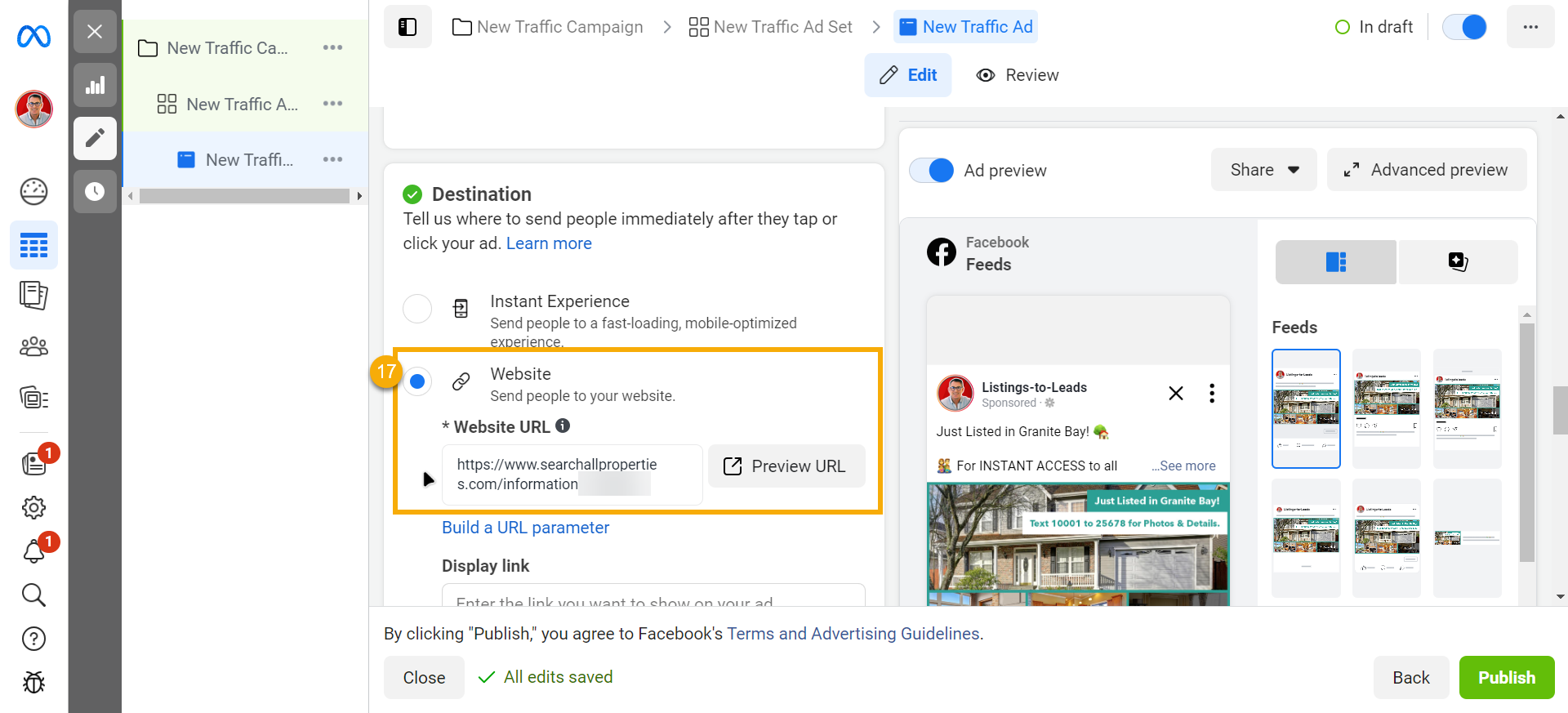 You can copy the Single Property Website link by following the steps below: - Return to the Facebook Ads Manager and Paste the URL of the Listing Landing Page or Single Property Website in the Destination > Website section.